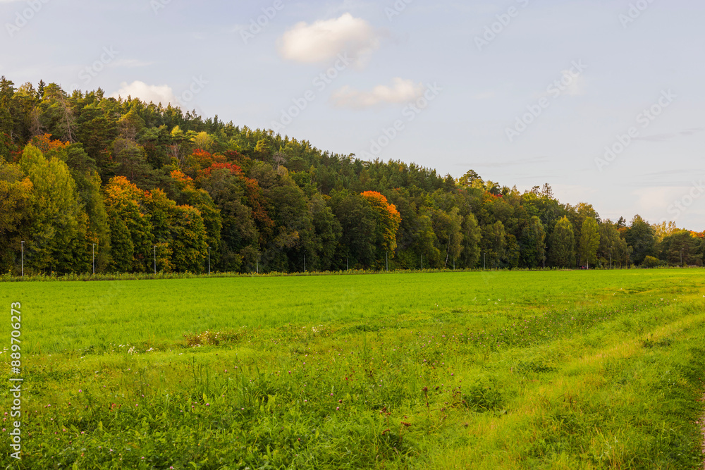 Beautiful view of agricultural field with crops, set against autumn landscape with forested trees growing on hillside. Sweden.