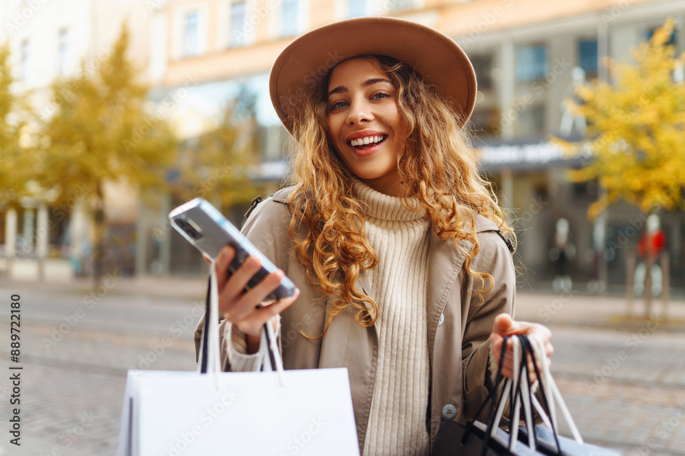Fall elegant woman carrying shopping bags walking city street. Consumerism, sale, purchases, shopping, lifestyle concept.