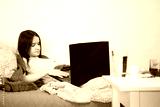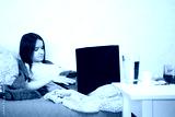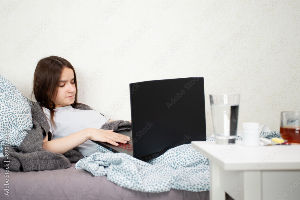 Online pharmacy, young sick woman orders medicines on a laptop via the Internet, patient at home using laptop for pharmaceutical needs.
