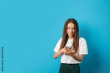 Teenager with mobile phone on blue background, young cute emotional student, using smartphone, smiling at screen, sending a message