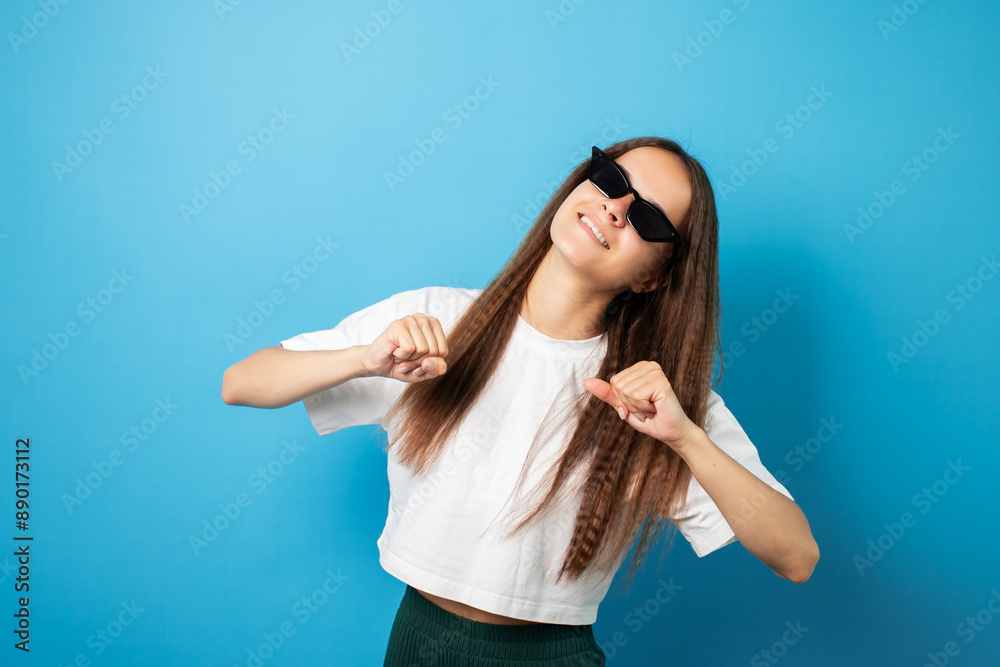 Teenager dancing on blue background, young cute emotional student, carefree model smiling in studio.
