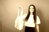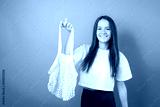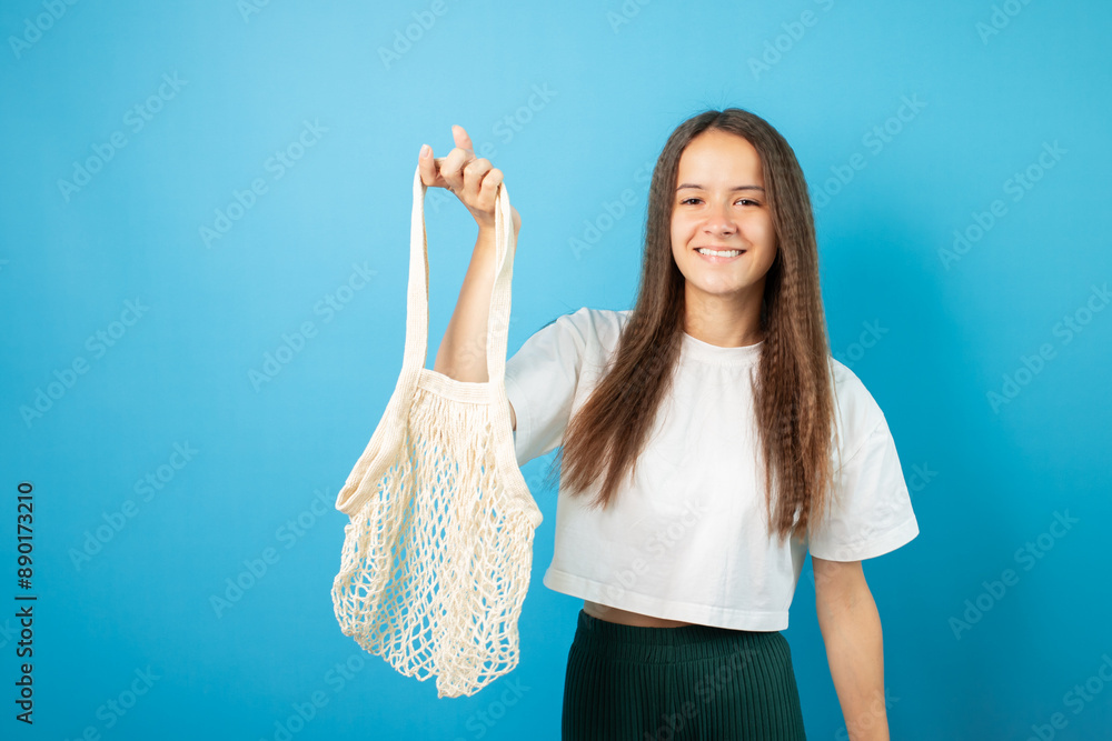 Net bag, teenage girl with reusable mesh, shopping for groceries at the market, zero waste living