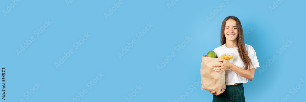 Teenage student with a bag of groceries, online order pickup, young woman in a retail shop,background of a supermarket, positive girl with a purchase