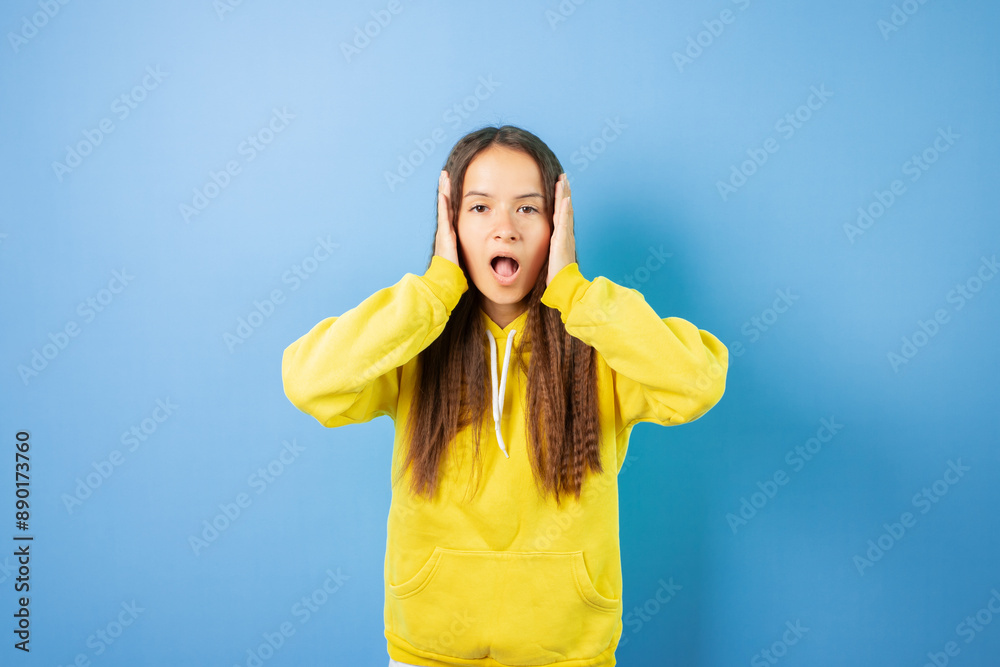 Teenage student happily holding her head, curly haired female posing stylishly, positive cheerful girl in studio.