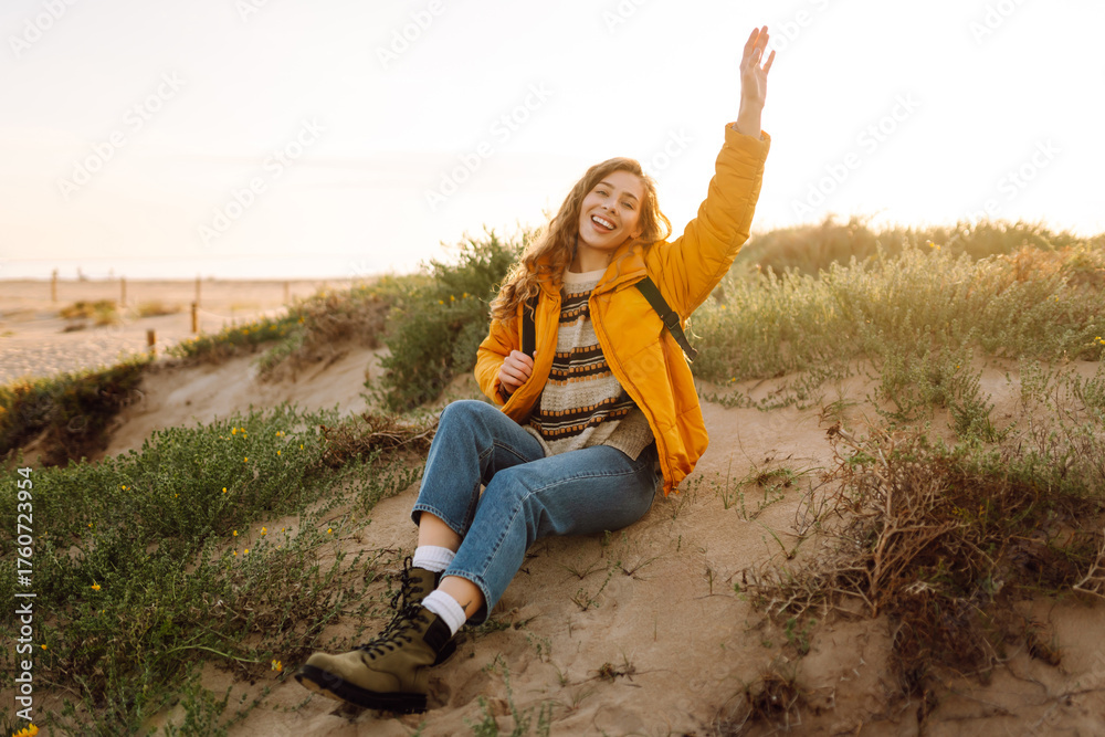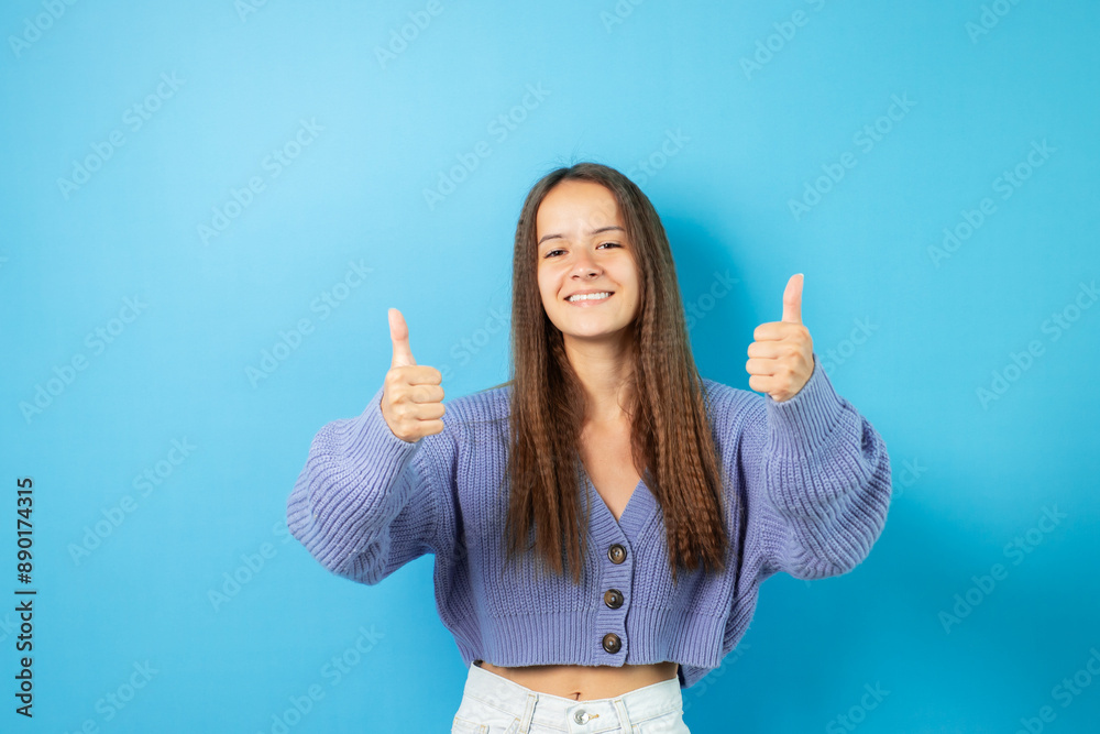 Teenager shows thumbs up, adolescent with arm gesture, stylish cloth