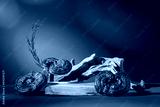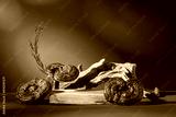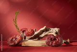 Empty wooden podium arranged with lingzhi mushrooms and a tree branch. Green leaves decorated on red background. Lingzhi mushrooms have more than 400 different nutrients.