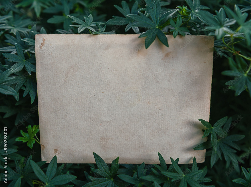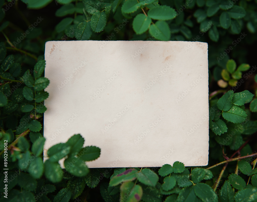 Vintage empty paper lies on green leaves of a plant, creating a rustic and natural background
