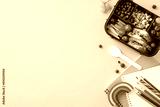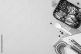 Flat lay image of a healthy school lunch box with vegetables, fruits, nuts, and a notebook with colored pencils on a vibrant yellow background