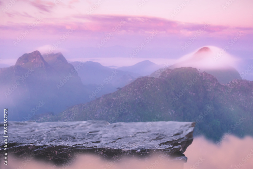 Surreal grey stone podium table top on pink cloud mountain nature landscape background with space.Cosmetic beauty product placement pedestal rock stand display,minimal dreamy concept.