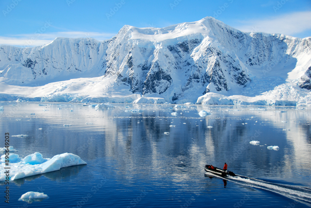 Boat travelling through Antarctic landscape, adventure travel image