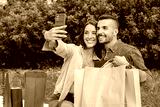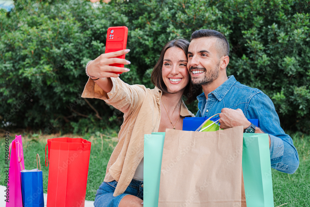 Young adult couple sitting at the downtown mall and taking a selfie portait showing their shopping bags. Two smiling couple having fun shooting a photo to share on the social media application