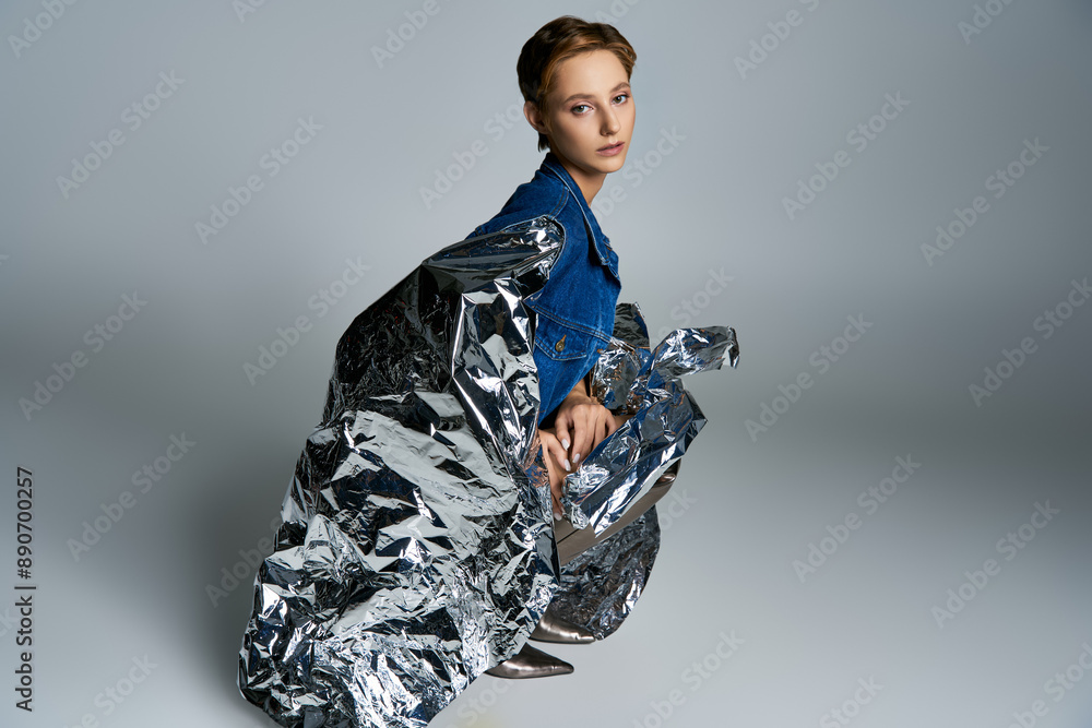 A woman sits, wrapped in a silver blanket, a blue denim jacket framing her thoughtful expression.
