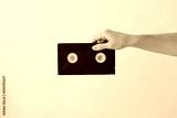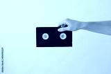 A hand holding a black VHS tape. The tape is black and white and has a white circle in the middle