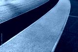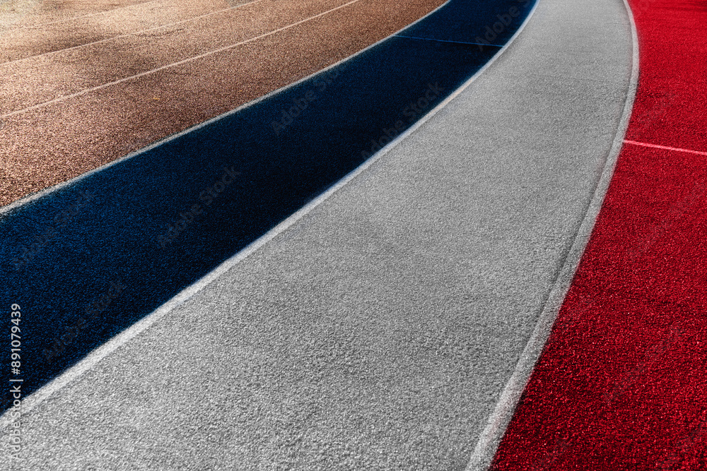 red blue white France flag running tract with white line in sport stadium of for Olympic 2024 sport competition background.