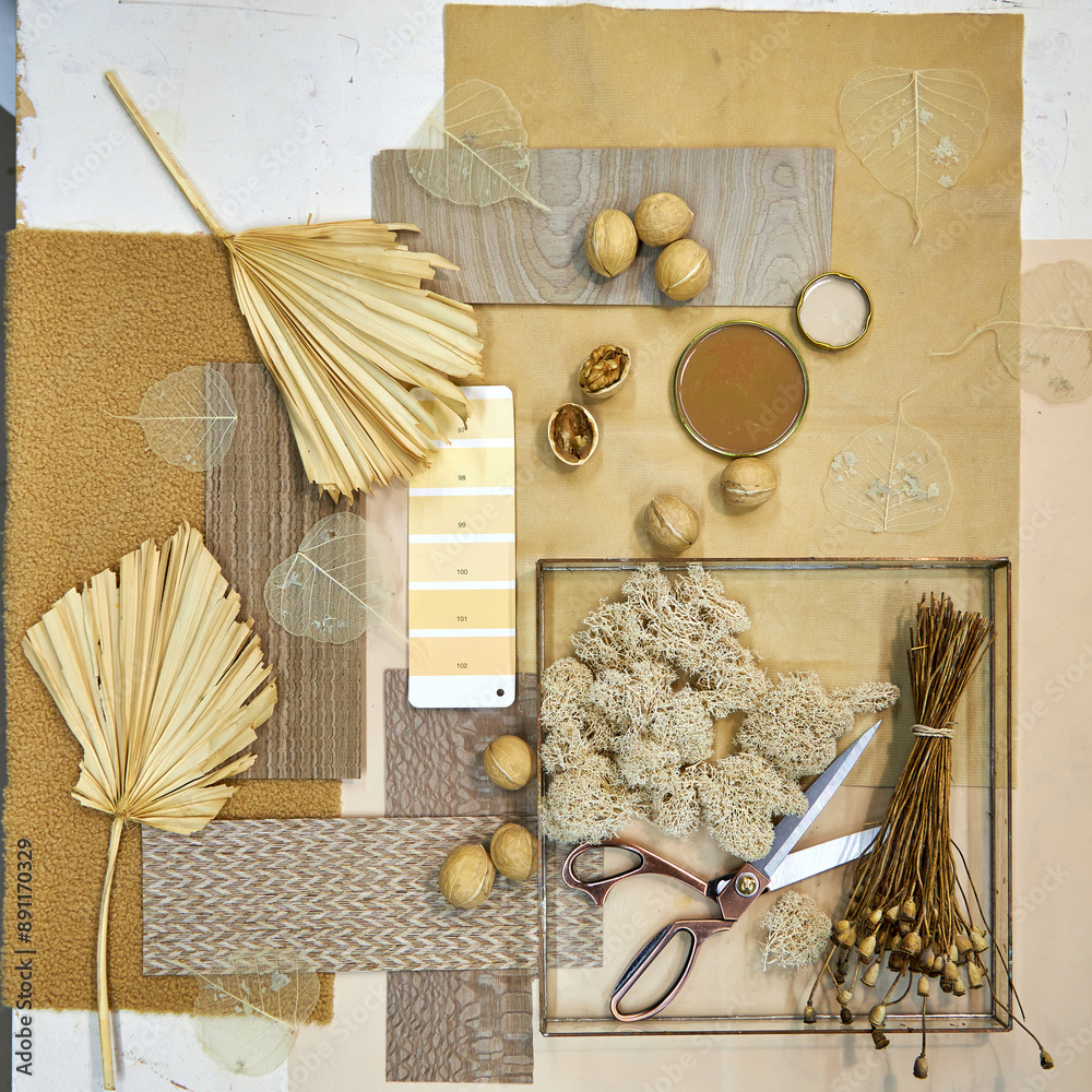 color palette in neutral beige tones, mood board, collage for interior design and decoration