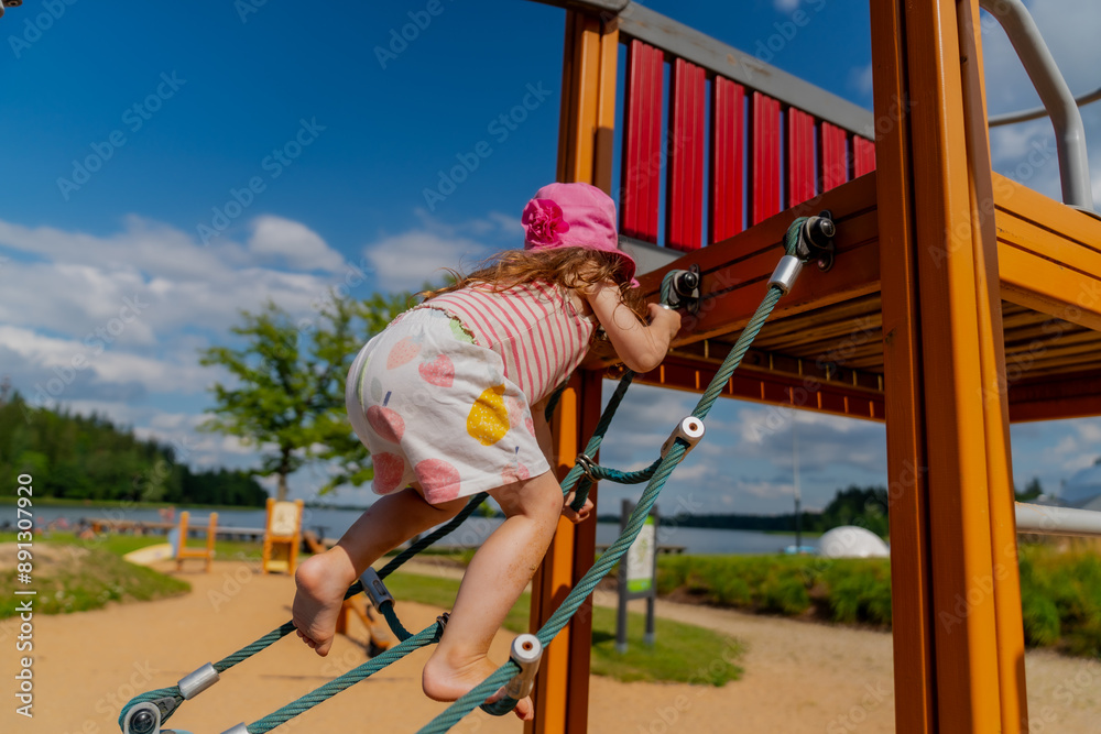 Toddler girl with pink hat playing in children playground in summer climbing on ropes