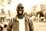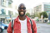 Smiling cool gen z Black hipster guy wearing red shirt, backpack and sunglasses posing outdoors. Close up portrait of happy young adult African man hipster standing on city street looking at camera.
