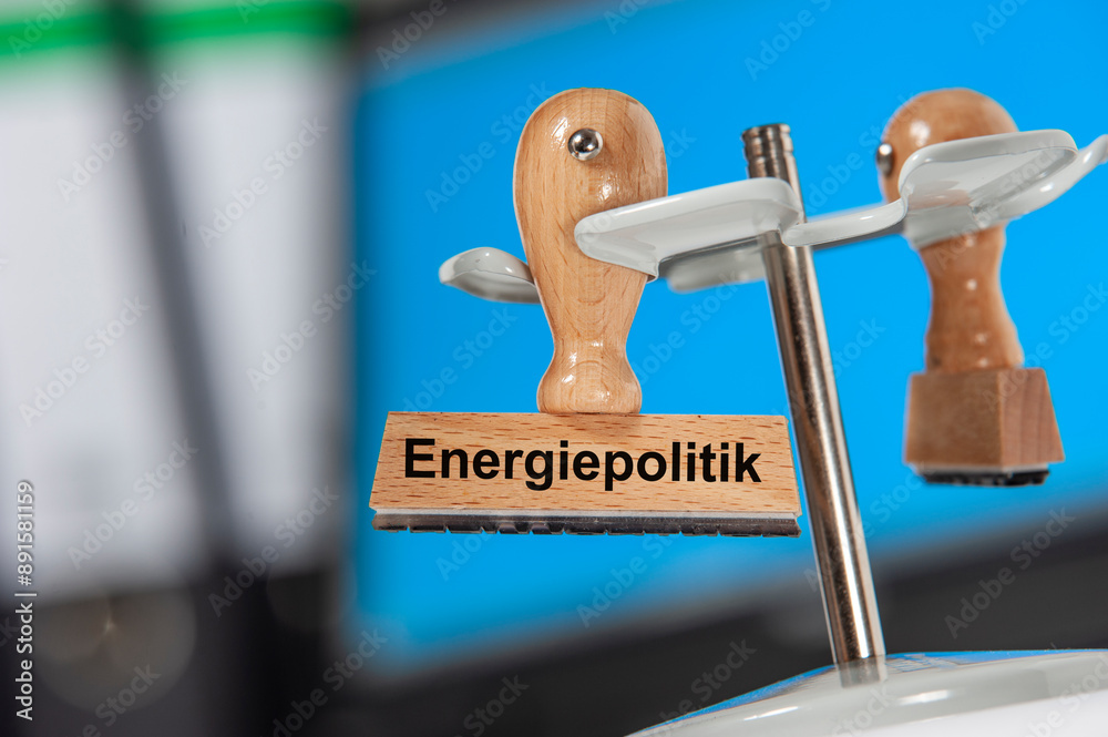 Ein Holzstempel ist beschriftet mit dem Aufdruck: Energiepolitik