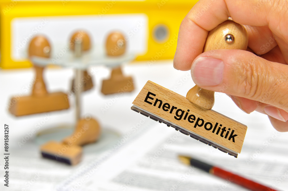 Ein Holzstempel ist beschriftet mit dem Aufdruck: Energiepolitik