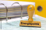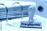 Ein Holzstempel ist beschriftet mit dem Aufdruck: Energiepolitik