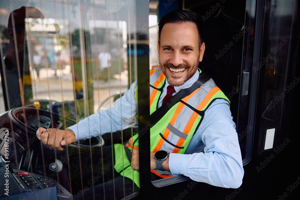 Happy public transport driver behind wheel in bus cabin looking at camera.