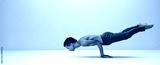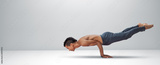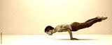 Muscular shirtless man demonstrating impressive strength and balance in challenging yoga position. Fitness inspiration, yoga tutorials, or wellness marketing.