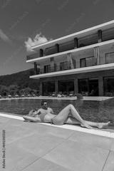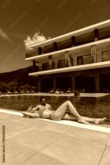 Attractive woman in swimsuit relaxing by the swimming pool