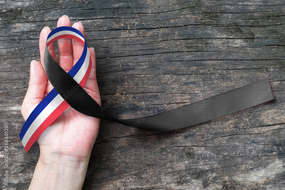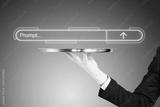 A person in formal attire holds a tray with neon-glowing prompt design on a gray background, concept of service and technology