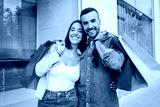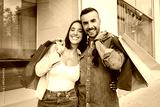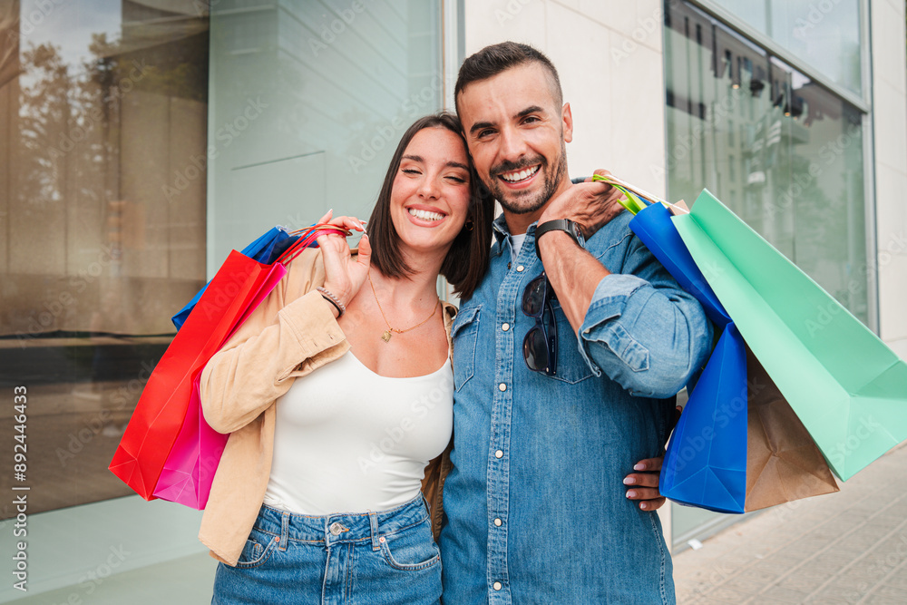 Young couple smiling and looking at camera carrying shopping bags walking on the city mall. Boyfriend and girlfriend laughing near the storefront. Customers buying presents or gifts together