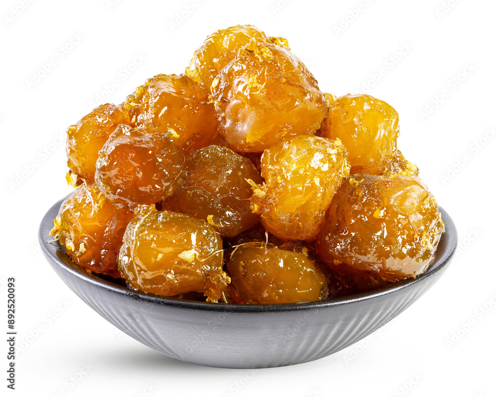 Sweet and sour stir fried soft plum with ginger in a black ceramic bowl