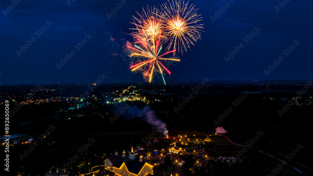 Brilliant Gold And Colorful Fireworks Burst Against The Night Sky, Illuminating A Rural Fairground With White Barns And Small Churches, Enhancing The Festive Atmosphere Amidst The Dark Landscape.