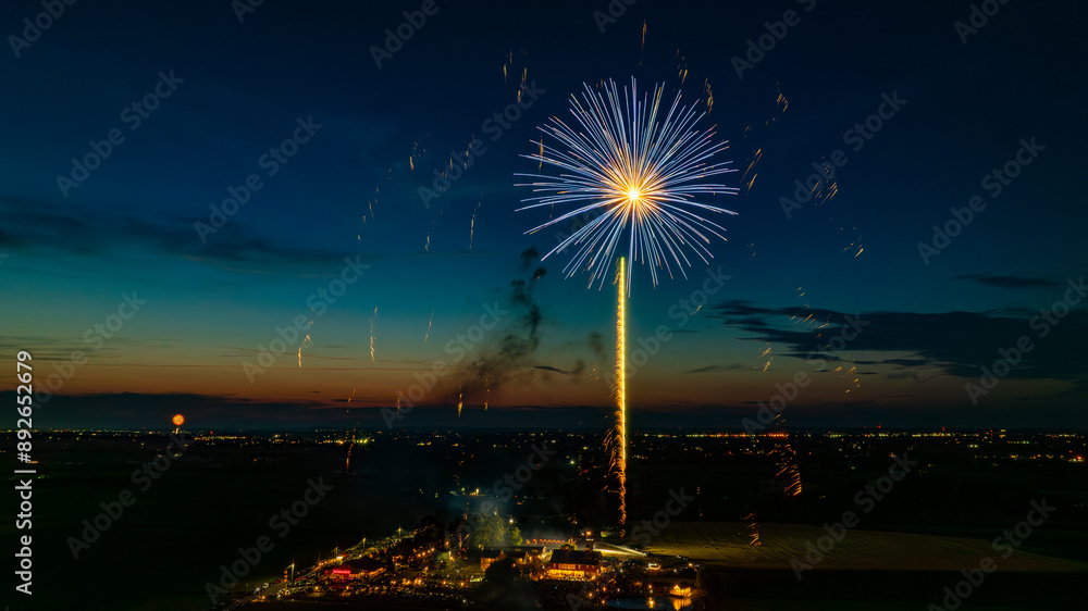 Blue And Gold Fireworks Burst In The Night Sky, Illuminating The Distant City Lights And Gathered Crowd Below, With A Vibrant Twilight Horizon Enhancing The Festive Scene.