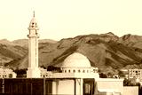 Sunrise view of a mosque on the background of mountains. Dahab, Egypt.