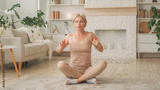 Breathing practice. Healing exercise. Peaceful calm woman sitting in yoga pose on floor inhaling exhaling deeply in living room home interior.