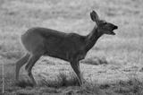 Capreolus capreolus european roe deer female on a field. Open mouth.