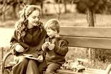 Mother and Kid Son Reading on Park Bench