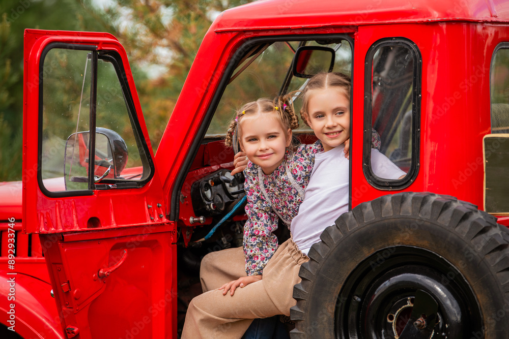 Two cheerful girls are sitting in the cabin of an old vintage red SUV. Travelling by car.