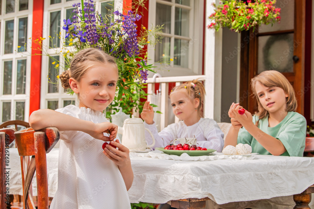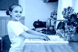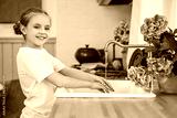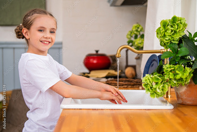 child washes his hands under a brass faucet in the interior of a country house kitchen.