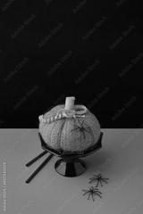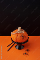 Autumn handmade textile decoration on orange table. Cozy fabric pumpkin. Halloween decor.