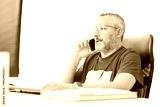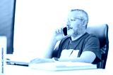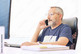 Focused middle aged man of Indian descent speaking on the phone while works in his bright office, wearing glasses and dressed in casual clothes