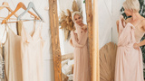 Wardrobe choosing. Party clothes. Stylish inspired confident woman trying on elegant beige chiffon dress at mirror in light interior at home copy space.