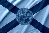 Florida US state flag depicted on folded wavy fabric of old cloth close up