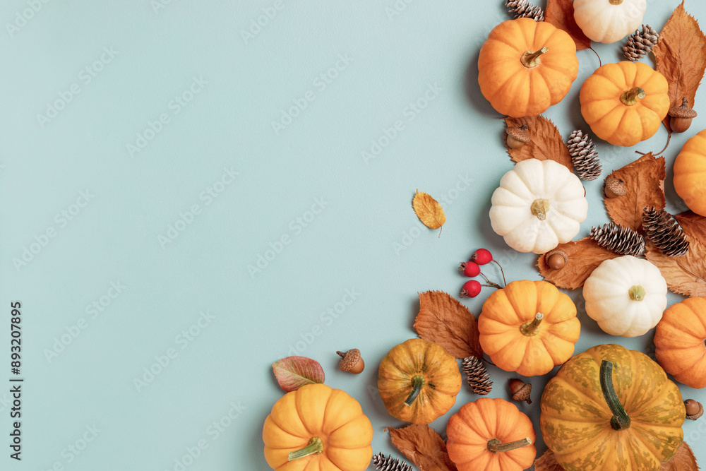 Autumn holiday composition from decorative pumpkins, dried foliage, red berry, pinecones and acorns top view. Thanksgiving day, harvest, autumn and fall background top view..