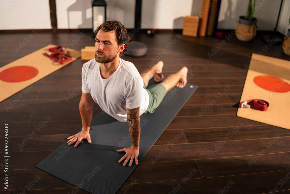 A man practicing yoga indoors, performing the upward-facing dog pose on a black yoga mat. The room has wooden floors and other yoga mats and props are visible in the background.