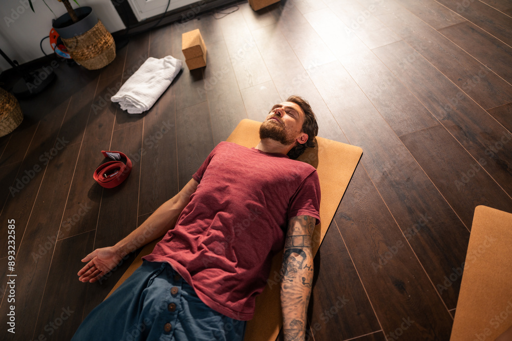 A man lying on a yoga mat in a relaxed position, possibly meditating or resting after a workout. The setting appears to be indoors with wooden flooring and yoga props like blocks and a towel nearby.