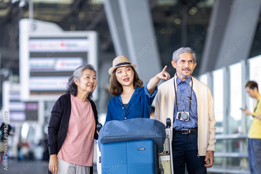 Group of Asian family tourist passenger with senior is leaving airport terminal for transportation during their vacation travel and long weekend holiday concept