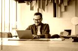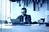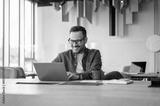 Confident handsome programmer in eyeglasses developing software over laptop at desk in modern office