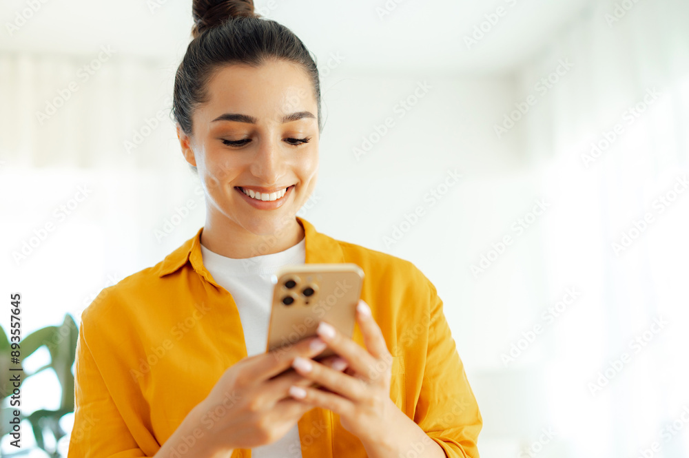 Using gadgets. Photo of a positive pretty arabian or indian young woman in orange shirt holding smartphone in hands, typing message in social media, browsing internet, checking e-mail