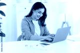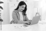 Positive successful gorgeous brunette arabian or indian ethnicity young woman, IT specialist, product manager sits at a work desk working in a laptop in office, looking device screen, smile happily