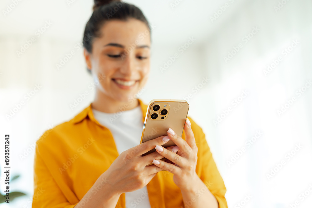 Using gadgets concept. Photo of a defocused positive pretty arabian or indian young woman holding smartphone in hands, typing message in social media, browsing internet, checking e-mail